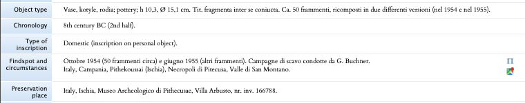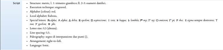 - Palaeography: this section provides, if relevant, the text layout (e.g. it is specified if it is stoichedon).