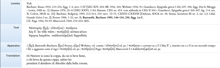 - other editions, and the notices in the epigraphic bulletins, such as the SEG (Supplementum Epigraphicum Graecum), and the BE (Bulletin épigraphique). The editions are arranged in a lemma genetico, which reproduces the hierarchy of the editions. It lists the autonomous editions, which generally derive from an autopsy of the document and often offer new readings of the document. Each autonomous edition is followed by the dependent editions (namely the editions that accept the autonomous one, in square brackets).
