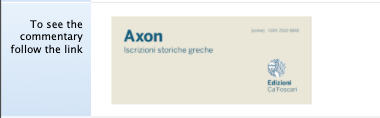 - Following the complete bibliographical references of the other publications cited in the Axon record, in the lemma and in the apparatus or in the commentary in the journal Axon (for further information about our journal, see below). The titles of scientific journals are consistent with the APh (Année Philologique) standard. In some cases, some abbreviations, not present in the APh, are needed. The list of all abbreviations adopted, followed by the full title of the journal, can be consulted and printed from the 'Journals' drop-down list.